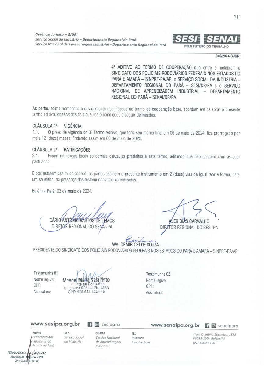 4º ADITIVO AO TERMO DE COOPERAÇÃO SESI SENAI e SINPRF-PA/AP./2024